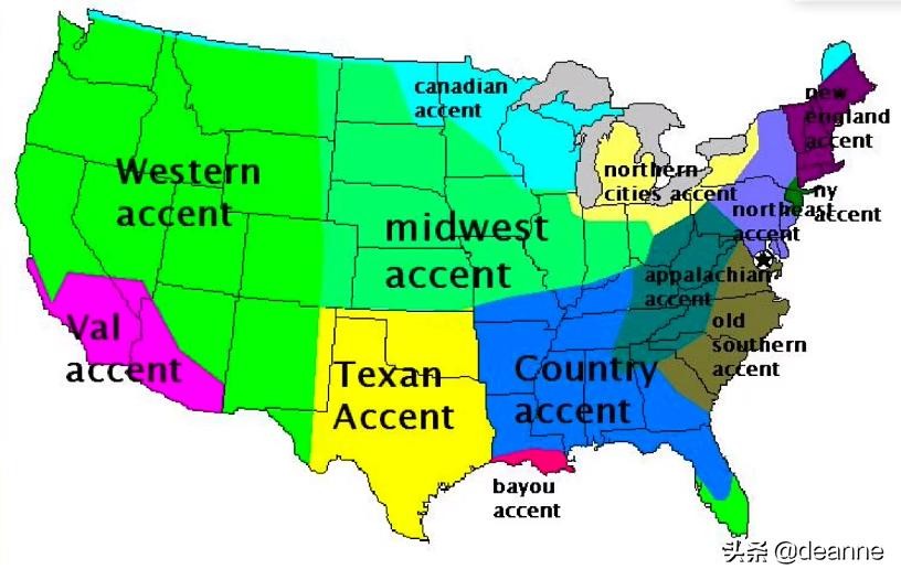 美国南北部居民之间口音也存在差别,我们所追捧的美国普通话 (General American),我们容易听懂美国各个州同样也是地域不同口音不同,参见下面的美国地图(图片参考李晨老师讲课视频截图),因此某培训机构所号称发音纯正值得深思。
