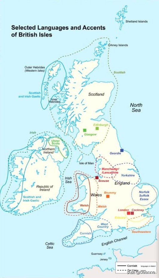对于语音本身而言,即使一个国家内部地域间的口音仍有巨大差别,英国各个地区也是有着差异的,英国南方一般以牛津、剑桥以南地区为准。南方口音普遍接近标准英语,一般是指RP,即Received Pronunciation,是英国的标准发音。目前,真正使用纯正RP发音的人在英国不超过3%,流行于英国社会中上层。即使BBC broadcast现在也不是都用纯正的RP。下图是英国地图,其中实线区域是被政府定义为方言;(图片引自李晨老师视频讲座截图)