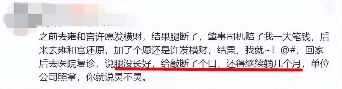 顺带一提,前面那个在雍和宫许愿发横财的网友事后去还愿,一时没管住自己的嘴,又加了个愿,结果再次被“服从调剂”了一把——