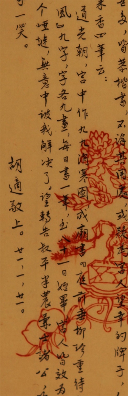 此次整理出胡适的两通信札,其中一通缺了上半部分,当另有受信之人。此信并非胡适直接写给刘半农,应当是受信人将此信后半部分重新抄录后交于马衡、刘半农、沈兼士传阅,最终留在刘半农处,故由刘最终保存下来。经过研究后,确认了陈垣致刘半农的一通信与此有关,因此此信为陈垣抄录了胡适的信并转交给刘半农的。信中所述之事与《胡适日记》民二十一年1月21日条的记载相吻合。(照片五)