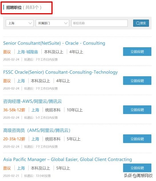 根据某求职网站上的数据,德勤不同分所用人需求各不相同。比如上海所,目前在招的职位有83个,涵盖的部门丰富多样。