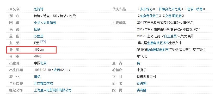 刘诗诗百科的身高是165cm,对外宣传的身高也是165cm。