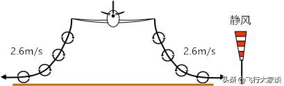 通常情况下(静风),飞机后面的尾流会向下和向外运动。向外运动的速度约在2.6m/s,如下图所示: