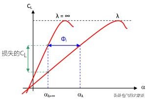 对于给定的迎角αλ=∞,无限展弦比机翼和真实展弦比机翼之间损失的升力系数CL,如下图所示: