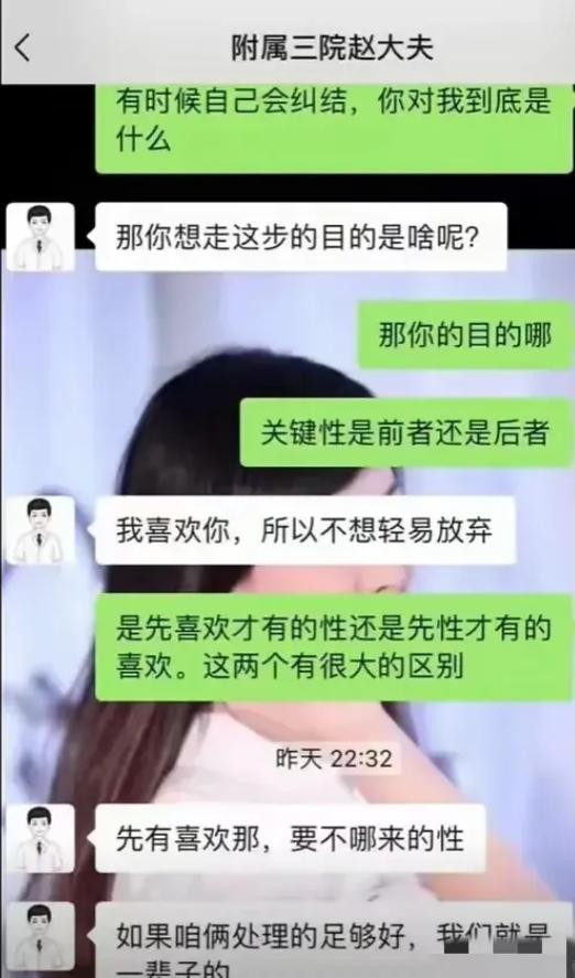 赵医生的聊天记录可谓是相当“火辣”。例如,他说的“肯定是先喜欢你,要不然哪来的性呢?”这种话听起来就像是在菜市场讨价还价,完全不像是医生会说的话。而那些“重温战斗过的地方”的暧昧言辞,更是让人脸红心跳,简直像是在翻阅一本现场版的言情小说。这些内容实在是让人难以将他与“白衣天使”的形象联系在一起。