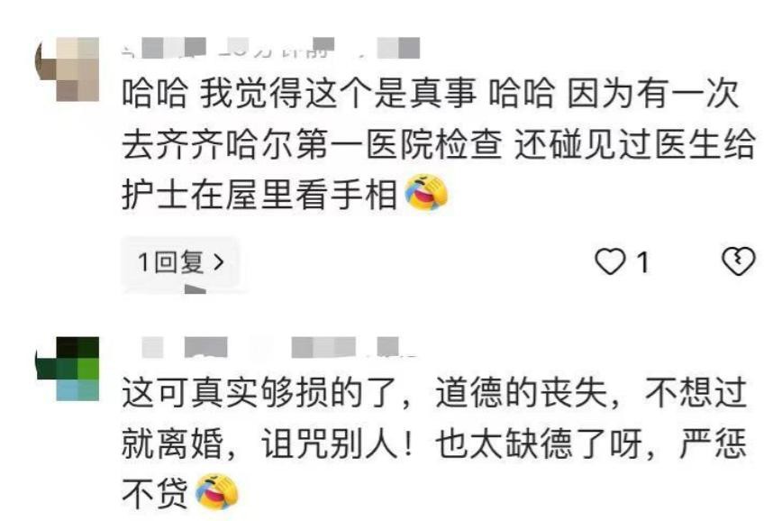 另一位网友直言不讳地说:“虽然目前这只是网上的传闻,还没有得到证实,但我个人觉得这很可能是真的。因为有一次我去第一附属医院检查时,经过某个房间,看到一位医生在给一位护士小姐姐看手相,两人看起来相当愉快。这样的场景让我对这些传闻不由得多了一分相信。”