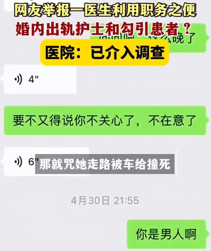 最近,一篇名为《医院男医生婚内出轨,恶毒诅咒妻子,聊天记录曝光》的帖子在网上引发了热议。一位声称是医生妻子的网友爆料称,她的丈夫在上班期间不仅出轨,还频繁和患者暧昧。而且,在夫妻的聊天记录中,这位医生居然用恶毒的语言诅咒妻子,希望她失去一切。这种行为让人感到难以接受。