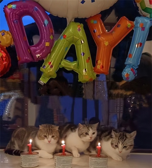 当天在为猫咪过生日时,还布置了现场,为三只小猫咪都准备了蛋糕,只不过是猫罐头,每一个猫罐头上都插有蜡烛,三只小猫也是非常的乖巧的窝在一旁,有一只猫也是紧盯着猫罐头,一看就是比较调皮的一只 。