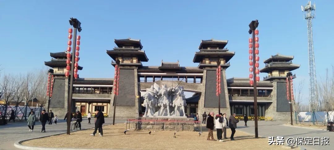 天空澄澈如洗,刘备、关羽、张飞雕塑在景区入口处稳稳矗立,仿佛在向人们诉说着那段义薄云天的英雄故事。
