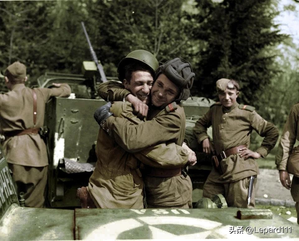9,1945 年,一名苏军在易北河附近拥抱一名美国军人