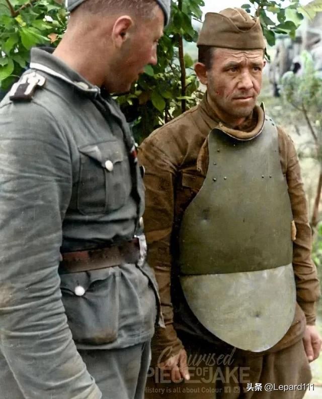 8,1944 年,在卡累利阿地区,一名德国士兵与一名穿着Sn-42型防弹胸甲的苏联囚犯交谈。