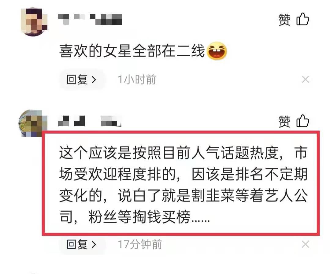 有网友指出:“这个应该是按照目前人气话题热度,市场受欢迎程度排的,而排名则是不定期变化的,说白了就是割韭菜等着艺人公司,粉丝等掏钱买榜而已!”