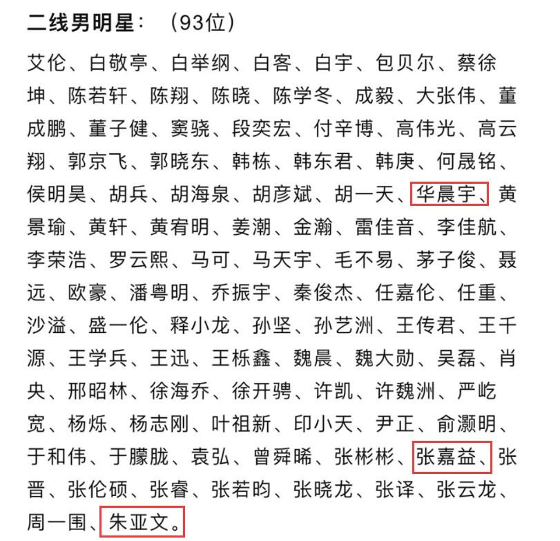 比如说像张译、张嘉益、于和伟、朱亚文等这些实力派演员,居然排在了二线阵列中。这四人中哪一个演技会比一线那些男星中的差?除非有一种可能,按粉丝量和曝光度以及商业活动的多少来说界定,不然实在难以服众。