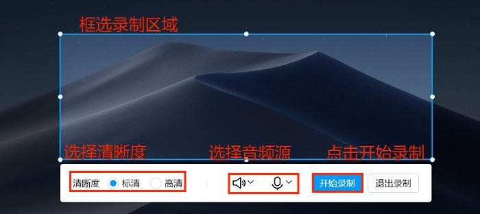 步骤2:在录制页面,自由框选需要录制的区域,然后选择录制的清晰度、音频源后就可以点击“开始录制”进行录制了。