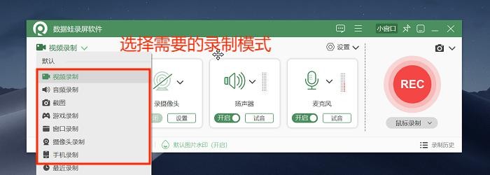 步骤1:下载好软件后打开,可以在软件左上角选择录制的模式,本文选择“视频录制”。