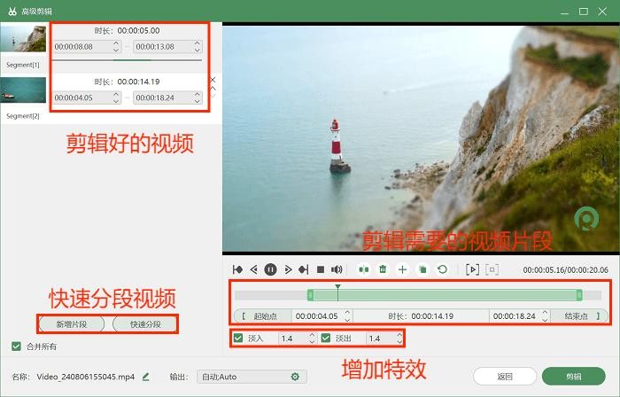 步骤3:录制结束后,可以在视频预览页面预览视频,还可以点击下方的高级剪辑工具对视频进行编辑,比如剪辑需要的视频片段、快速分段视频等。