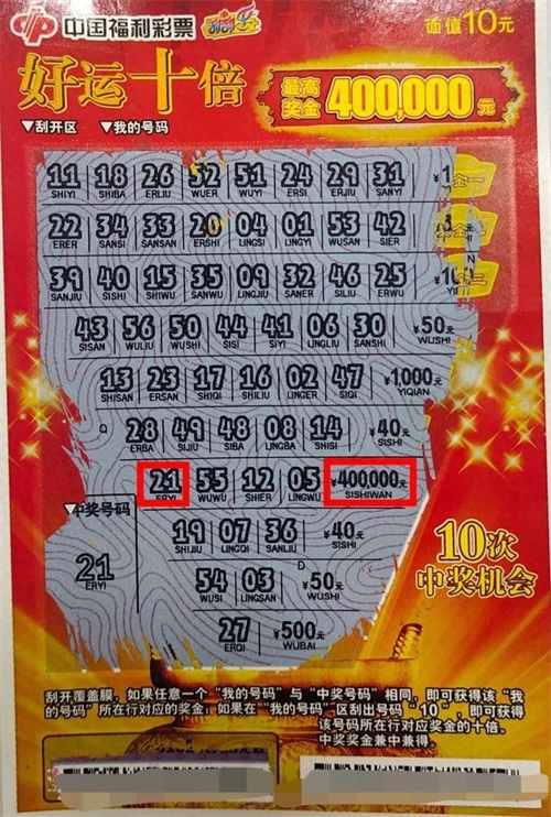 小杨是金华本地人,从2015年就开始接触福彩,最大的爱好是空闲时分购买福彩刮刮乐,有时独自购买,有时约上好友一起合买。12月14日,小杨约上一位好兄弟,一起来到金华万达三楼福彩综合体代销点,随机挑选了1本“好运十倍”,两人合买后一起刮。没想到,在倒数第五张“好运十倍”的第7行第1个号码中,刮出了“中奖号码”“21”,中得最高奖金40万元。