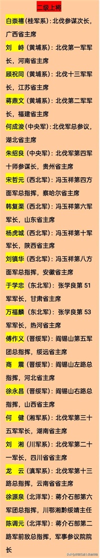 其中,第二批授衔二级上将20人,都是各派系军中任主要职务的将领,同时,他们在当时几乎都是担任了各地省主席职务。