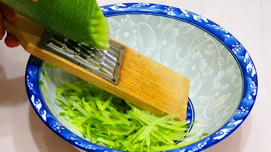 1、取一根青萝卜,冲洗干净表皮后再切去口感不好的头和尾。然后用擦菜板擦成丝,放在碗内备用。萝卜丝不需要剁细,丝状的口感会更好;另外,因为现在的青萝卜都是刚挖的,吃起来水分足、辛辣味轻,所以不需要焯水,吃着原汁原味还可以防止营养流失;
