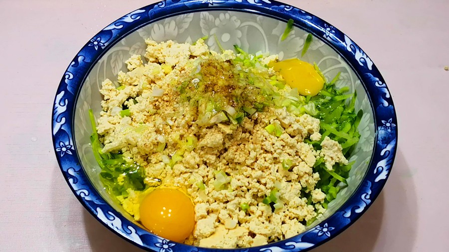 2、然后再把豆腐渣和萝卜丝放到一起,再开始调味:先加入1勺盐、适量的花椒粉、两个鸡蛋,充分搅匀后再加入适量的面粉,分少量多次加入,一边倒一边搅拌,搅拌至馅料用手抓起后能捏成团即可。