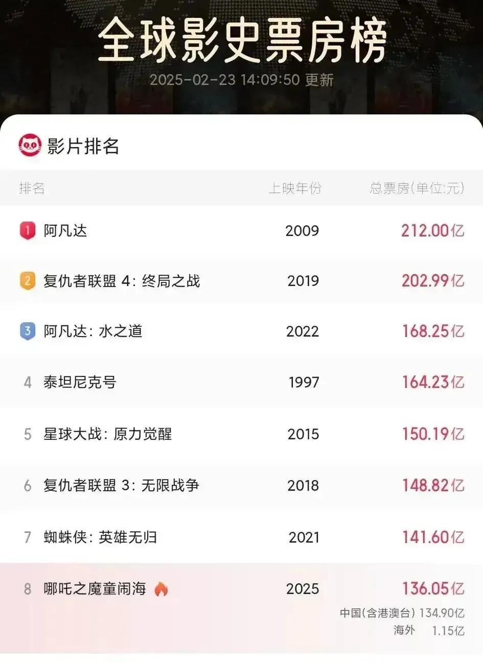 更令人震撼的是,据猫眼专业版数据,截至23日14时,《哪吒2》全球总票房已突破136亿元,稳居全球票房榜第8位,距离第7名的《蜘蛛侠:英雄无归》仅差6亿!而人工智能平台DeepSeek大胆预测:该片最终票房有望冲击152亿至173亿元,极可能跻身全球影史票房前五,刷新动画电影纪录!