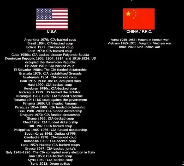 西方媒体宣传中国威胁论,但是纵观历史,自从上世纪战争结束之后,我国一直以来都是以维护自主领土和主权,倡导和平发展,就算是爆发了战争,也是一些保卫反击战,然而美国却无时无刻的在参加到各种战争中去。