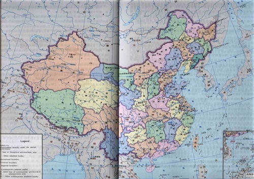 有关我国疆域:1945年9月抗日战争胜利,根据《开罗宣言》和《波茨坦公告》,被日本侵占50年的台湾省归还我国②。1905年由沙俄转为日占旅顺口、大连湾地区收回改置大连院辖市。1899年法租广州湾地区,收回改置广东省辖湛江市。其他各城市和租界地和通商口岸也都陆续收回(不见图)。1946年1月,当时南京政府承认外蒙古独立,唯详确疆界,尚待勘定。抗战期间被日本侵占的我南海诸岛,胜利后相应收回。1947年我国派人员及军舰前往接收,并鸣炮升旗,勒石树碑为志。
