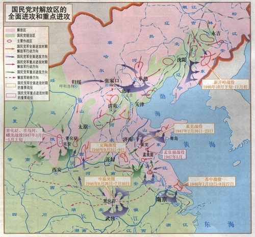 解放战争前期,全国解放区划分为陕甘宁、晋绥、晋察冀、东北、晋冀鲁豫和华东等大区。1947年5月1日,正式成立了内蒙古自治区。解放战争后期,适应全国解放的需要,将全国划分为华北、东北、华东、中南、西北、西南六大解放区。1949年4月,建立了东北人民政府,并将东北地区划分为辽东、辽西、吉林、松江、黑龙江及热河6省,沈阳、抚顺、鞍山、本溪设直辖市。1949年8月,在华北新建平原省。