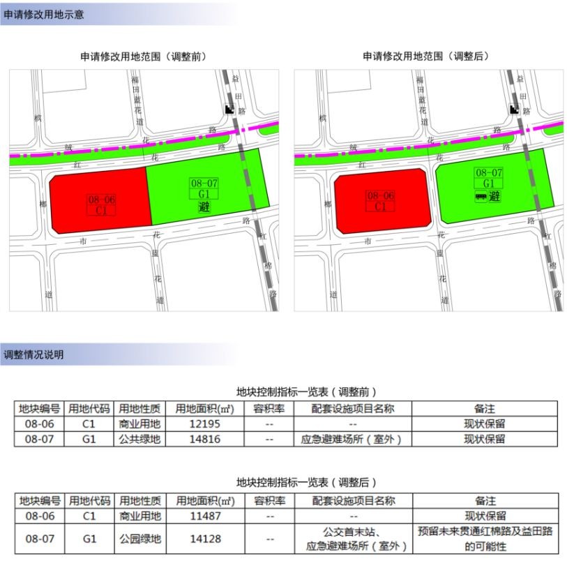 规划调整后08-06地块用地面积为11487平方米,其余规划指标不变;08-07地块用地面积为14128平方米,规划用地性质为公园绿地(G1),配套设施项目名称“公交首末站、应急避难场所(室外)”,备注:预留未来贯通红棉路及益田路的可能性,其余规划指标不变。