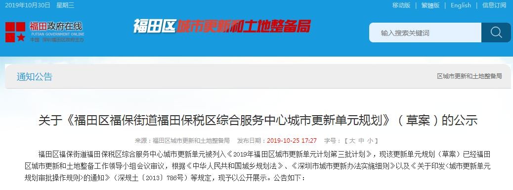 日前,福田发布了关于《福田区福保街道福田保税区综合服务中心城市更新单元规划》(草案)的公示。