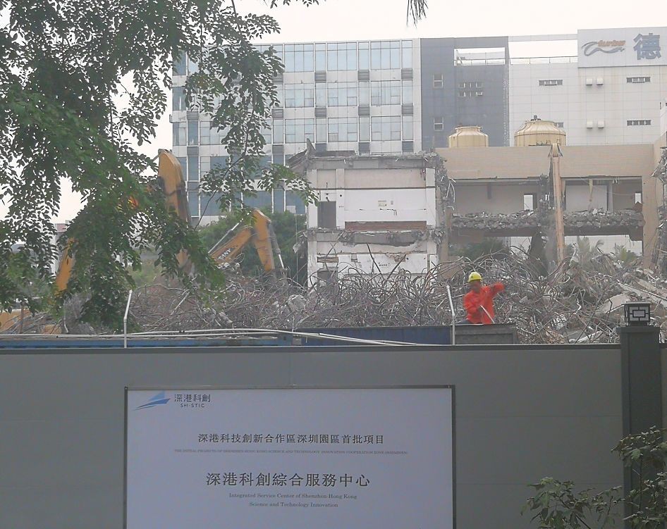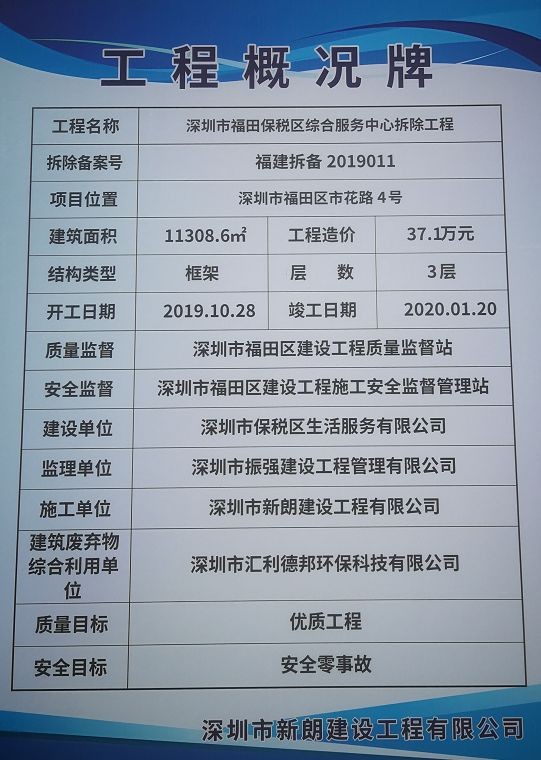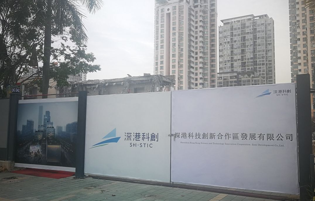 项目现场工程概况牌及挡板内容显示:项目名为“深港科创综合服务中心”,目前正在进行拆除工程,预计2020年1月20日完成。