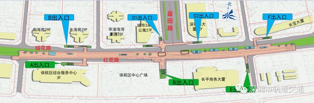 而根据今年6月底,深圳市轨道办透露的地铁3号线南延线福保站入口分布图显示:法定图则中的08-06地块即为福田保税区综合服务中心,连接福保站A出口,08-07地块即为福田保税区中心广场,连接福保站B出口。