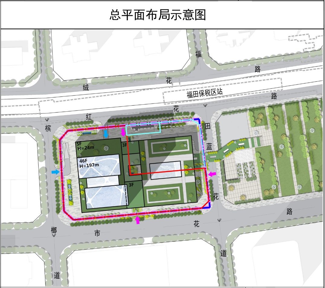 根据“草案”显示:项目位于福保街道(深港科技创新合作区内),西临槟榔道,北起红花路,南至市花路,东侧紧邻福田保税区广场公园。