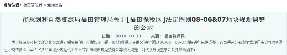 于此同时,当天(10月23日)[福田保税区]法定图则08-06&07地块规划调整进行了公示。在08-06地块、08-07地块之间新增一条宽度为15米的市政道路。