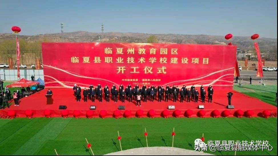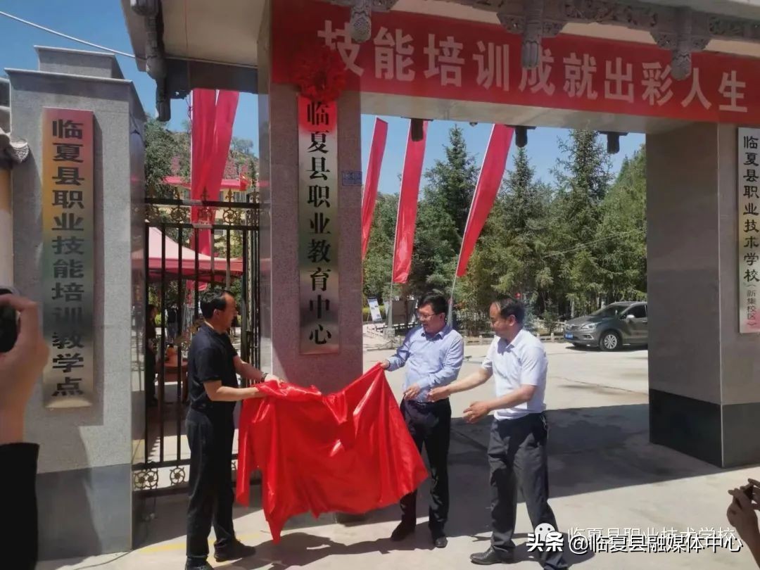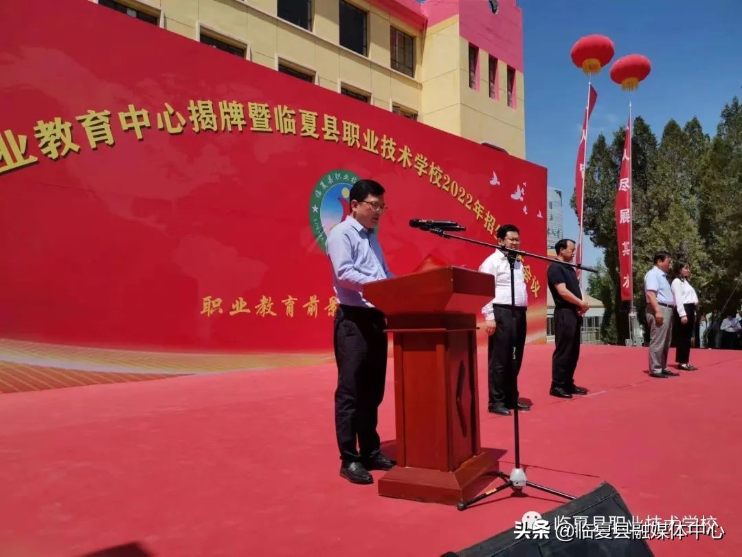 △县长马俊平和县委副书记马占彪为临夏县职业教育中心成立揭牌,马县长为统筹好我县职业教育发展进行致辞。
