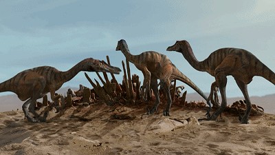 他们很快就会成为恐爪龙的美餐,而一大一小两只牛神也不露声色地紧随其后。