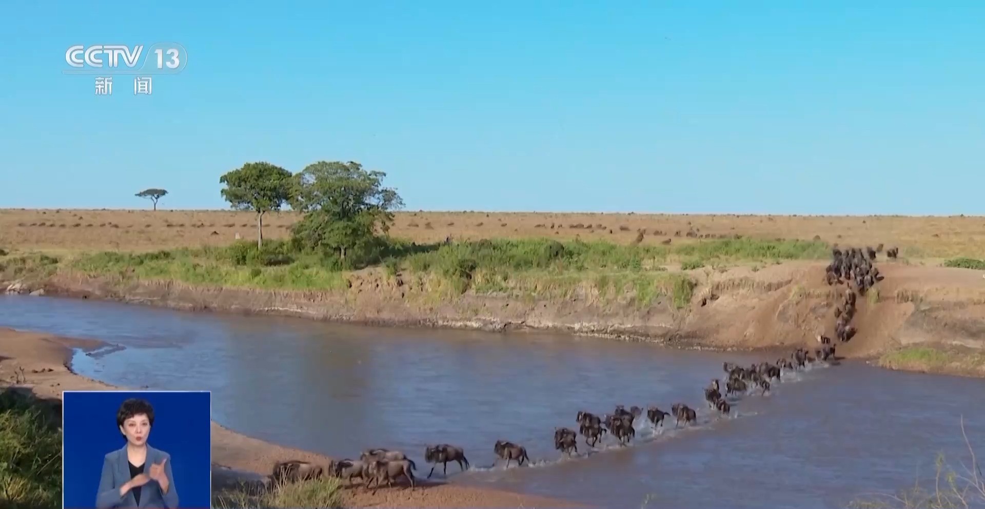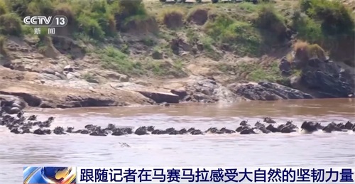 总台记者 刘晨:现在我们已经来到了马拉河边,身后有成千上万只角马正在渡河,这就是世界瞩目的东非野生动物大迁徙最壮观的景象之一。渡河开始的时候,勇敢的角马会率先进入河中,确认安全后,其余的角马再飞奔过河,一场大自然里的生死较量正在此上演。