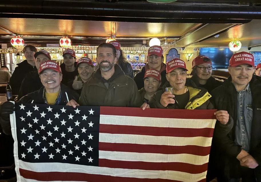 图二十 格陵兰人头戴MAGA帽子,手持美国国旗欢迎特朗普的大儿子到访