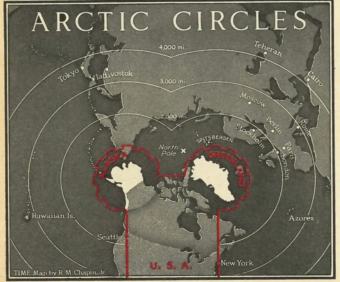 图十四 1947年,美国设想的以阿拉斯加、格陵兰岛为双桥头堡的北美战略防空圈