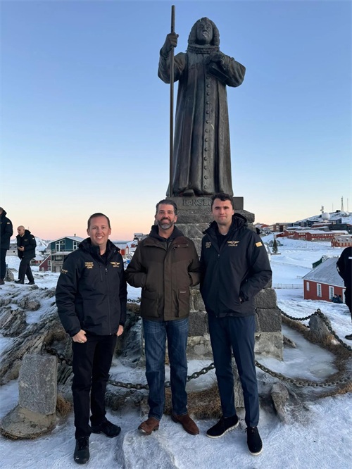 图七 2025年1月,特朗普的大儿子(中)在埃格德塑像前,埃格德被公认为格陵兰殖民地的创建者