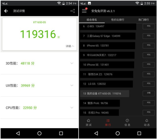 至于性能上Moto Z搭载的高通骁龙820小编就不多详细介绍了,毕竟在16年里各大厂商的旗舰产品基本上都不约而同地搭载这款CPU,Moto Z配备了2.2GHz四核骁龙820处理器,在小编体验过程中手机运行非常流畅,相机的启动速度非常快,指纹扫描仪也特别灵敏。据之前外媒对Moto Z的基准测试中看到,Moto Z的跑分甚至好过其他骁龙820机型。其性能超越了三星Galaxy S7和LG G5。不过有意思的是,Moto Z却在基准测试中败给了一加3。好啦,废话不多说,我们直接跑个分吧!