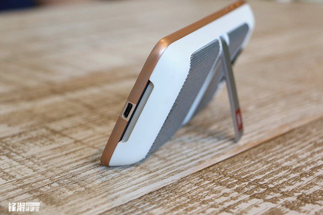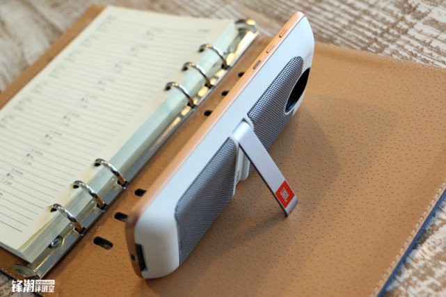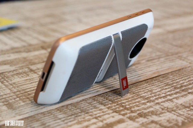 JBL扬声器模块配备1000mAh电池容量,虽然说1000mAh电池不算大,但是Moto官方称其可为Moto Z带来10小时额外的续航时间。经过小编一番玩弄,JBL扬声器模块在连续播放四小时后,电量还剩71%。在播放音质上,Moto Z自身的扬声器效果已经十分不错,但是总感觉缺少细节和低频的表现,但这也是目前市面上大多数手机的硬伤。而在搭配JBL扬声器模块之后,整个声音听起来更立体,而在这里还要表扬一下其背面的支架,这一个设计可以让JBL扬声器模块的声音从背面发出而不会被盖住。