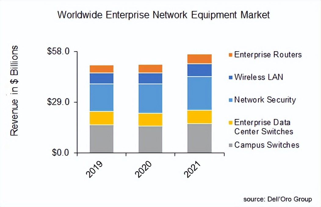 按柱状图的比例粗算一下,交换机(240+亿)、安全(190+亿)、WLAN(70+亿)、企业路由器与SDWAN(60+亿),都是美金哦~