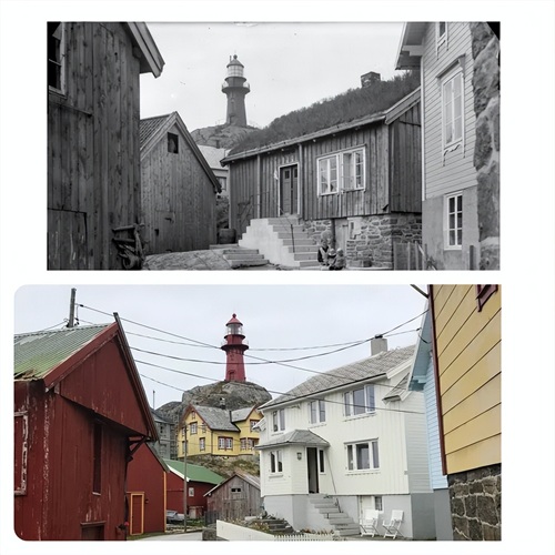 1930 年代与 2021 年,同一地点,挪威奥纳灯塔。灯塔建于 1867 年,至今仍在使用。