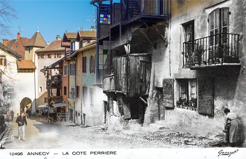法国安纳西,穿越时空。一张 18 世纪末的图像与过去几个月的同一地点之一相结合。这位年轻的绅士离女士只有几米远,却相隔100多年!
