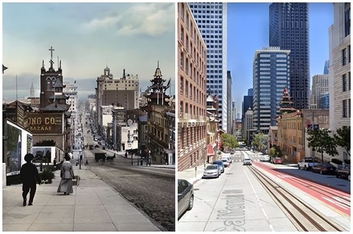 加利福尼亚街和格兰特大道的拐角处。1915 年和 2019 年