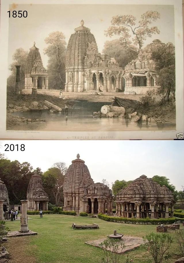 印度巴罗利寺庙。建于公元 10 世纪。1850 年的素描和 2018 年的图片。