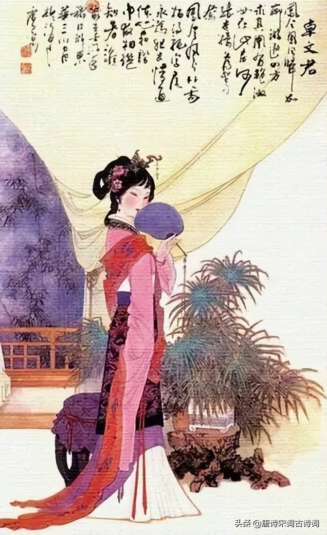 后来卓文君父亲被迫承认了这门亲事,给了卓文君嫁妆和钱财,二人的生活才好了起来。然而,后来司马相如凭《子虚赋》和《上林赋》得到了汉武帝的赏识,飞黄腾达后天天扎在美女和乐曲中,一度想纳茂陵女为妾,压根记不得远方还有一个日夜等待他的夫人。