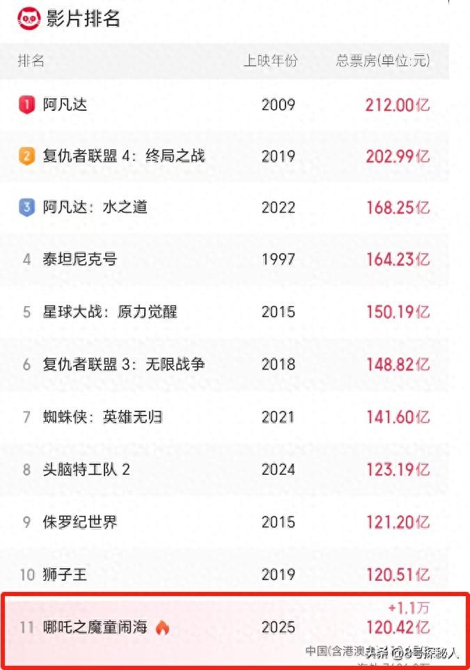 目前哪吒2的票房已经破120亿了,在全球票房排名第十一,按照咱们中国人凑整凑双数的习惯,让哪吒2一定得冲进前十势在必得。