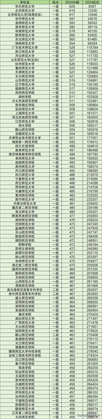 2024年分数线排名前100强的师范大学对应位次从288876名到8397名,对应分数从456分到629分,可见各校之间的最低分差异是较大的。